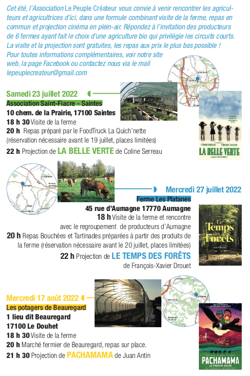 Pour initier ce cycle de projections, Le Peuple Créateur montera son écran dans les jardins de l’association Saint-Fiacre au 10 chemin de la Prairie à Saintes, samedi 23 juillet 2022, pour vous présenter le film La Belle Verte, de Coline Serreau.